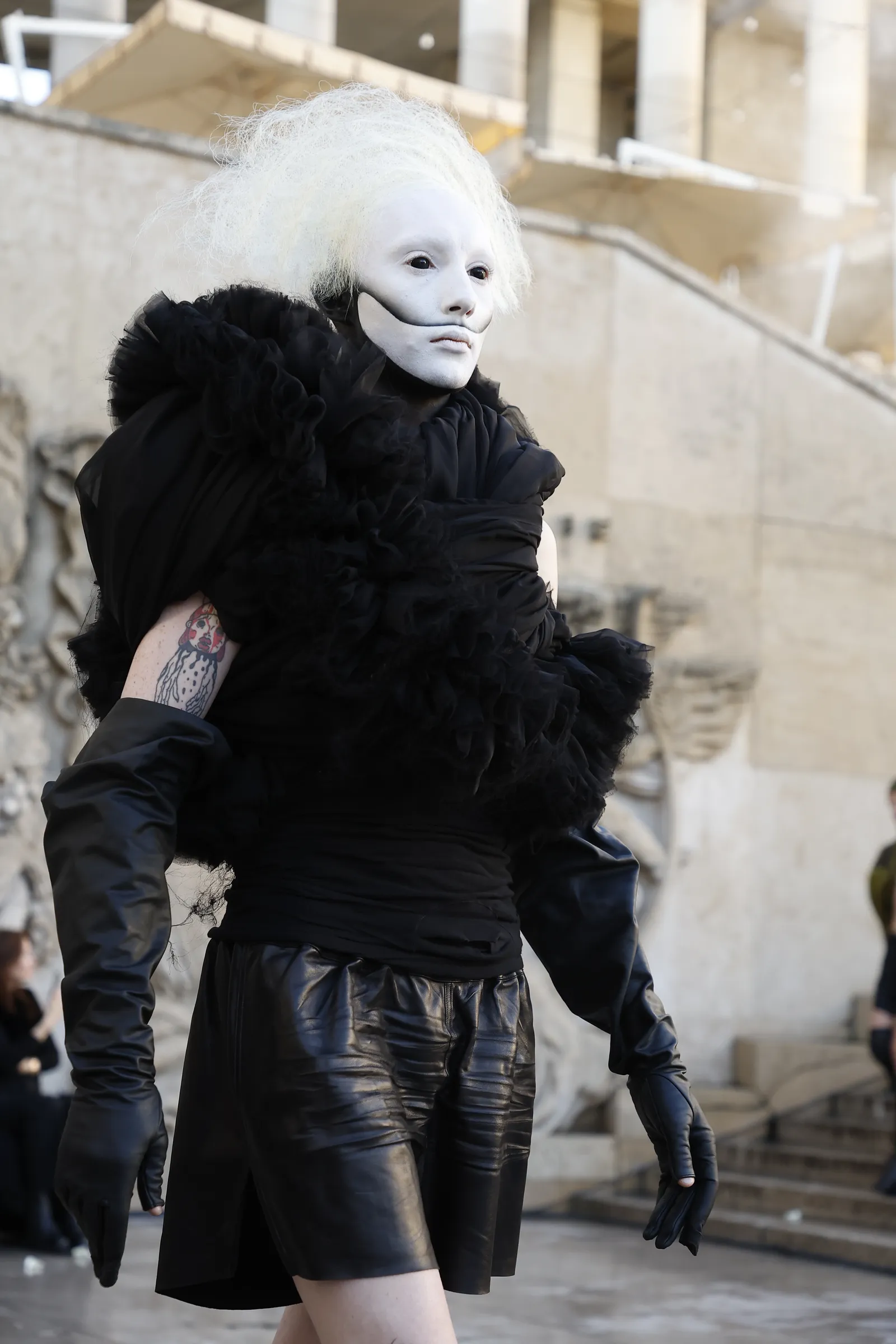 Sulla stessa scia visionaria, ma con forme diverse, si muove Rick Owens, profeta estetico del post-umano, in cui figure di zombie, alieni, creature tormentate, prendono il sopravvento sulla passerella.