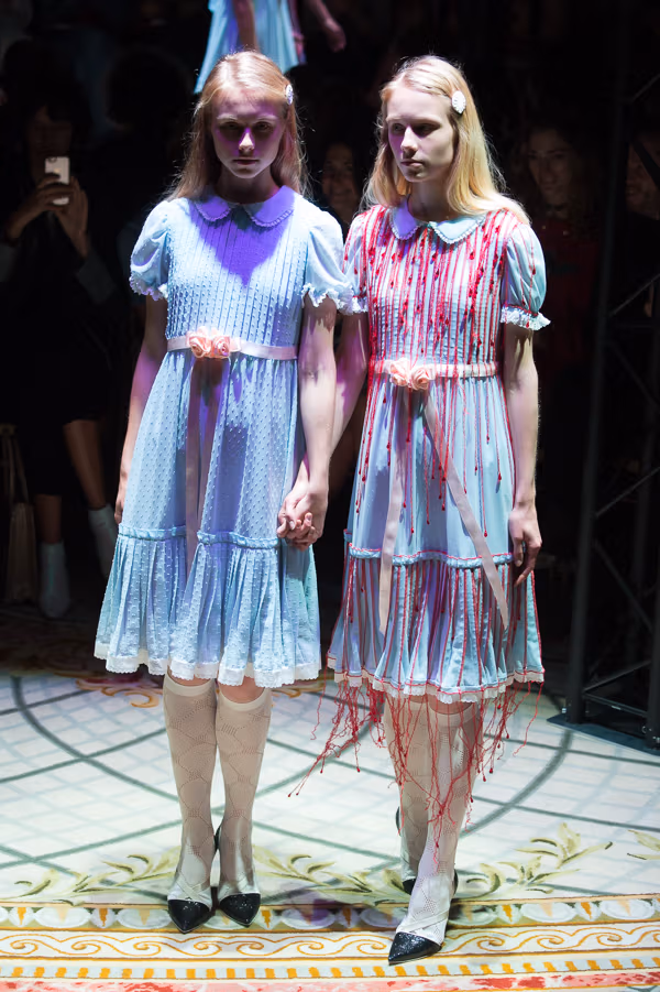 Undercover, del designer giapponese Jun Takahashi, porta in scena delle coppie di modelle in uno show inquietante per la sua Spring Summer 2018, ispirato chiaramente a The Shining, soprattutto quando a chiudere la sfilata sono due modelle che interpretano le sorelle Grady, indossando l'abito baby doll azzurro con il dettaglio narrativo del sangue che il designer ha evocato attraverso una cascata di perline rosse.